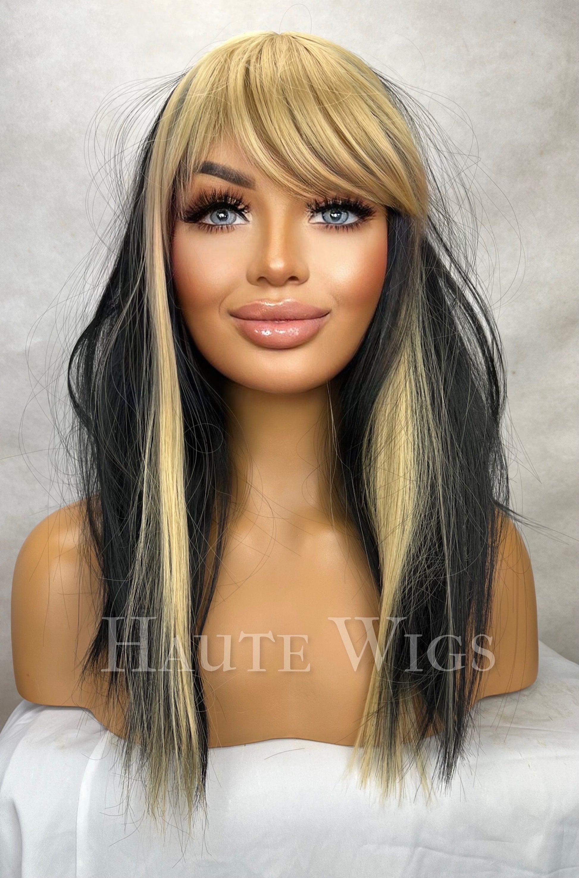 Hot mess - 20 Inch Long Womens Wig Black Brown | Golden Blonde Highlights Streaks Money Piece bangs fringe straight haute wigs role play